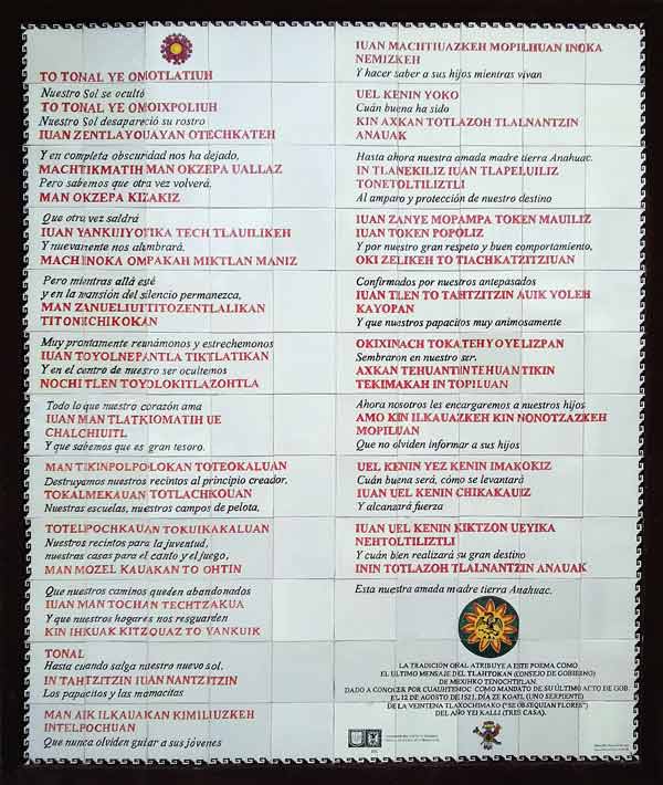 Una vez esclarecida la trascendencia de los Aztecas en nuestra región istmeña y en nuestra amada nación que hoy se constituye como México, deseo cumplir un sueño que he acariciado por largo tiempo; se trata de compartirles un poema que la tradición oral atribuye como el último mensaje del Tlahtokan (Consejo de Gobierno) de Mexihko Tenochtitlan.